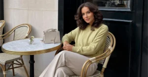 This beige mini skirt with a yellow-beige pullover is so cute! I’m loving the warm, neutral tones, ideal for a fall coffee date. Add a delicate scarf for a soft touch.