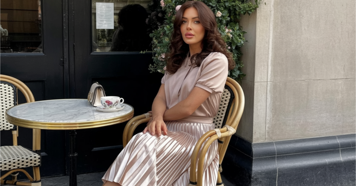 This pink skirt with a floral tube top and cardigan is like a warm summer hug! I’d wear it to an ice cream date, licking a cone. Style with a light cardigan and ballet flats to stay cozy and chic.