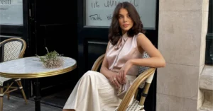 This outfit is such a stunning blend of elegance and simplicity. The creamy top paired with the silky blush skirt creates a soft, harmonious look that’s perfect for a serene church setting.