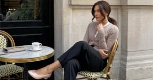 This outfit beautifully balances elegance with casual comfort. The knit top in a soft, neutral tone brings warmth and texture, which contrasts nicely with the flowing line of the black wide-leg pants. It’s a look that’s both sophisticated and effortless.