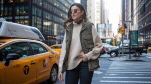 This Birkenstock outfit is effortlessly chic with its combination of a cozy knit sweater and wide-leg pants, perfectly paired with an olive puffer vest. The crossbody bag adds a sleek touch, and the muted tones of the Birks tie everything together in such a harmonious way.