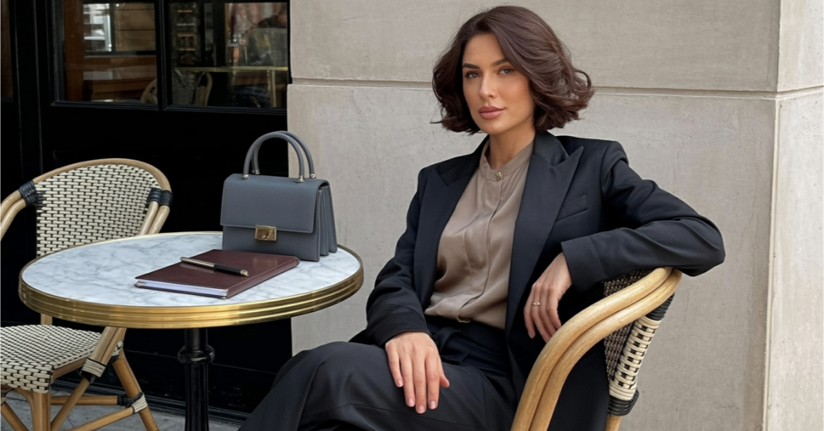 The structured bag is a classic piece that adds to the outfit’s polished feel, and the boots peeking out from under the trousers add just a hint of edge.