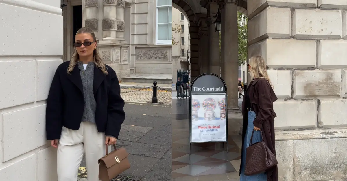 The brown handbag adds a chic touch, balancing the ensemble with a hint of warmth.