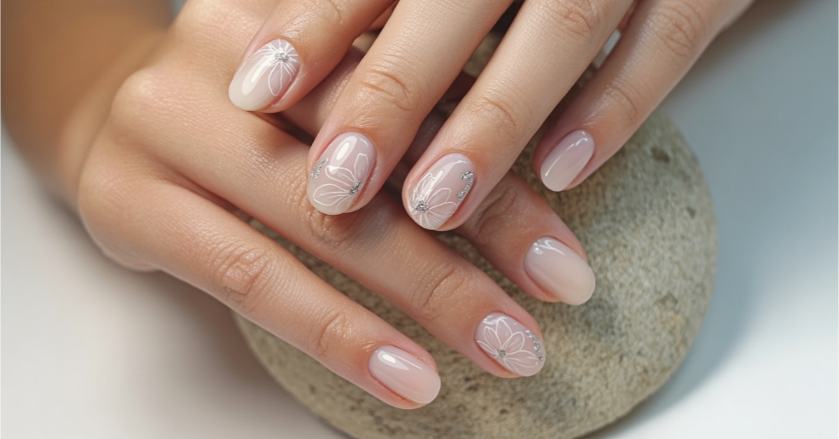 This clear neutral base with tiny white flowers is absolutely stunning! The sheer base keeps everything natural and elegant while the delicate florals add just the right amount of detail. I got this exact manicure for a job interview last spring and it was perfect because it felt polished but still showed personality. The simple flower nails approach here works for literally any occasion because it’s subtle but still beautiful. You can see your natural nail through the clear base which makes it feel fresh and modern!